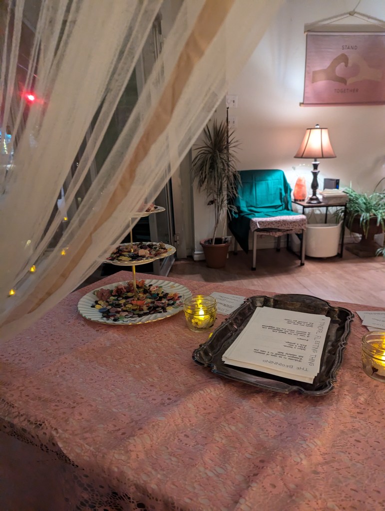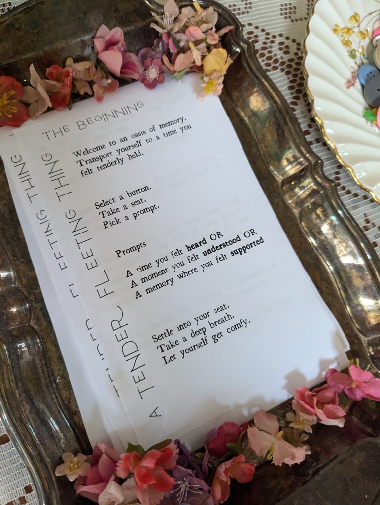 a tender fleeting thing was presented as part of the 2024 Lumiere Arts Festival. this project was a portal taking participants to a time they felt deeply held. guided by the Keepers of the Memory Oasis, participants were asked to step into a room of warmth and whimsy. each participant complete a self guided meditation and left with a small talisman to represent their time here.